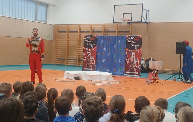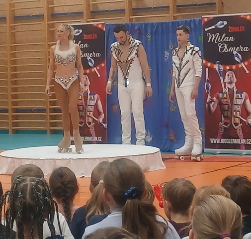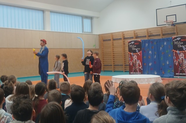 Ve čtvrtek jsme se první hodinu všichni sešli v naší tělocvičně,kde nás čekalo artistické představení Milana Ošmery a jeho přátel z Itálie. A opravdu se bylo na co dívat. Nadšeně jsme tleskali žonglování, tanečnici s obručemi, jízdě na kolečkových bruslích, kouskům s diabolem a zasmáli jsme se s klaunem. Ten si dokonce vybral Marka a Jakuba a dělal s nimi legrácky s nafukovacími balonky:-)